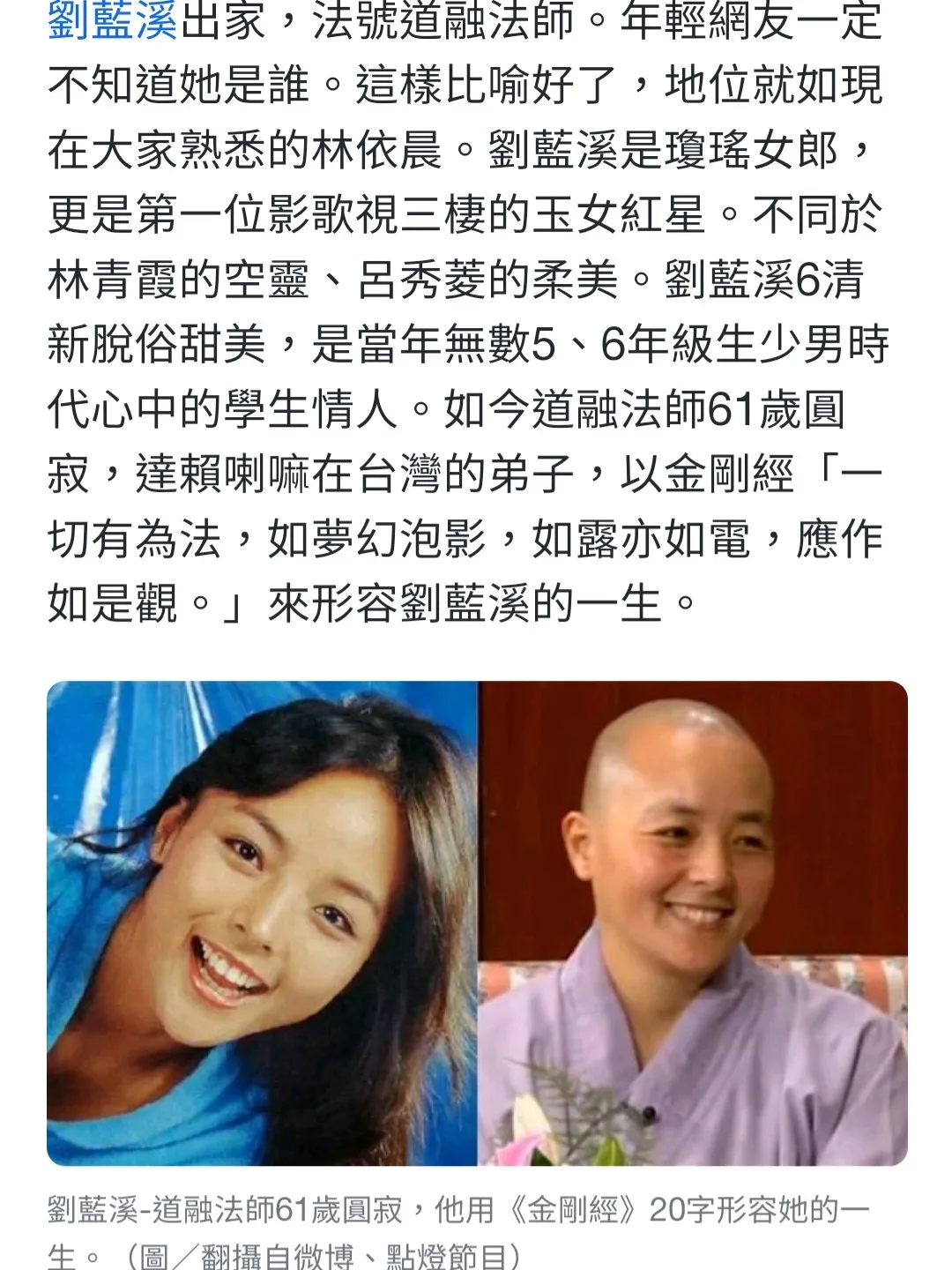 Dharma Master Daorong's Passing Dharma Master Daorong, before renouncing the world, was the famous movie star Liu Lanxi. One day, while reading and contemplating the wisdom of non-self in the Diamond Sutra, she was filled with joy and gradually awakened to her past good karmic connections and yearned for a monastic life. With her husband's support, and seeing the tranquility and peace that arose from her study of Buddhism, her family gradually accepted her wish to become a nun. Dharma Master Daorong once translated for His Holiness the Dalai Lama. Later, she studied Tibetan and, within the Drikung Kagyu lineage, spent many years studying and practicing teachings such as the "Five-Point Path of Mahamudra." She recently passed away on January 10th. During her cremation, signs such as a rainbow appeared. His Eminence Drikung Kyabgön Chetsang Rinpoche praised her deeds: "I rejoice in all the complete funerary rites for Dharma Master Daorong's passing! Firstly, the Master had unwavering faith in the Dharma and a constant, unchanging aspiration throughout her life; she was a true bodhisattva. Before her passing, she was able to fulfill her wish and overcome all difficulties to return from Taiwan to the US to see me. We met three times very easily, and during our meetings, her state of mind was always very peaceful and stable. Just as the sutras say, 'the ripening of karma is inconceivable.' Although the Master did not have a long life, she made very significant contributions to the Dharma during her lifetime. Just like her practice, her final message also mentioned what Gyaltsab Jey said: 'The enlightened guru, one's own mind, and the Buddha are one; practitioners who are without discrimination do not need to perform false devotion.'" The video is an interview by the television station shortly after the Master became ordained. Seeing the Master in Han Chinese monastic attire, speaking about her life and work in the Buddhist academy, with a peaceful and joyful expression on her face, is truly wonderful. It makes one think of what Dzongsar Jamyang Khyentse Rinpoche said: "First manifestation, then secret," which allows for a deeper appreciation of the essence of secret teachings. In the Master, we see a model of the integration of both exoteric and esoteric Buddhism. Interview Video: https://www.youtube.com/watch?v=X2bVZ18Yu_E&feature=youtu.be *Name:* *Location:*